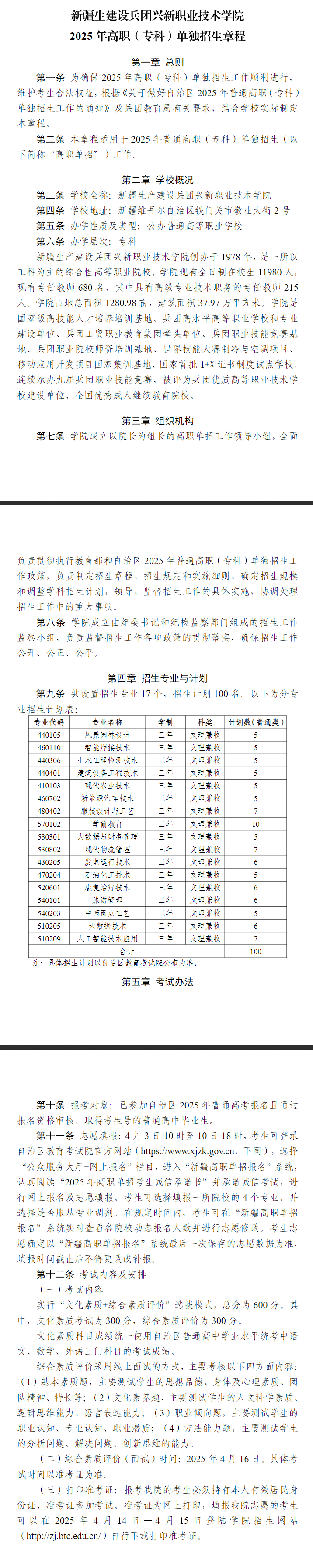 本文为大家整理的是2025年新疆生产建设兵团兴新职业技术学院高职单招章程,主要包含学校概况、招生专业、招生计划、收费标准、录取规则等信息,以下是详细内容,供大家参考。
