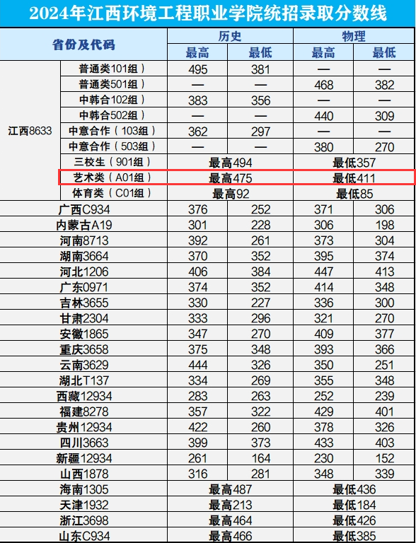 2024江西环境工程职业学院艺术类录取分数线(含2022-2023历年)