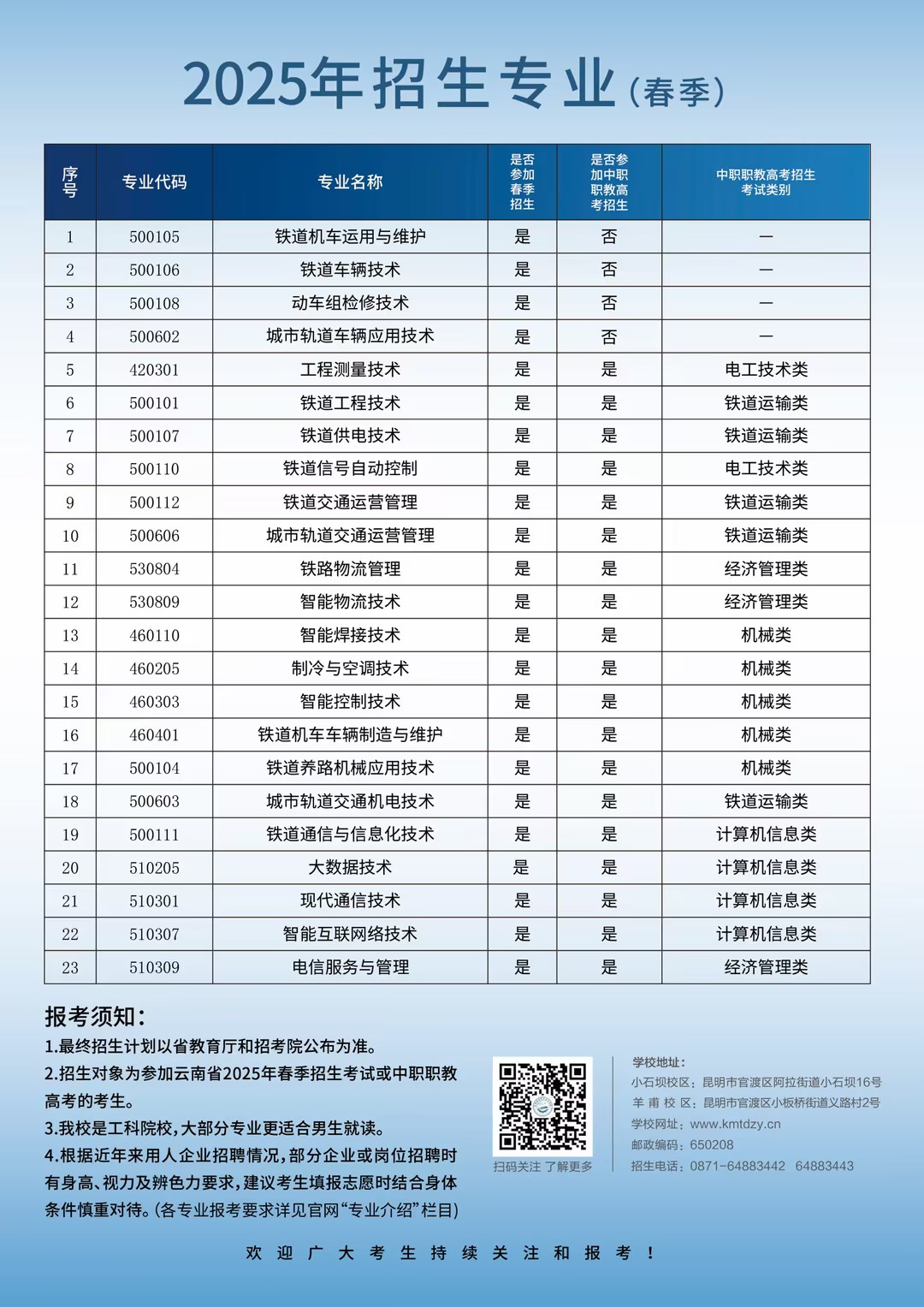 昆明铁道职业技术学院春季招生、职教高考招生专业有哪些?