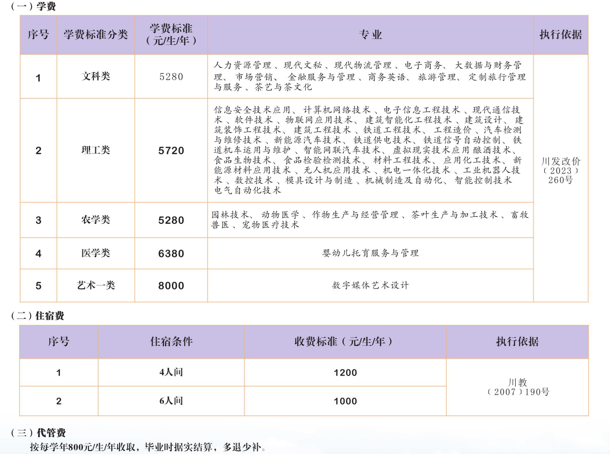 宜宾职业技术学院学费:普通类专业有5280、5720、6380元/生/年等不同标准,艺术类专业8000元/生/年;住宿费:4人间1200元/生/年,6人间1000元/生/年。以下为大家整理的是各专业收费标准,希望对大家有所帮助,如有变动,以学校最新公布的信息为准。