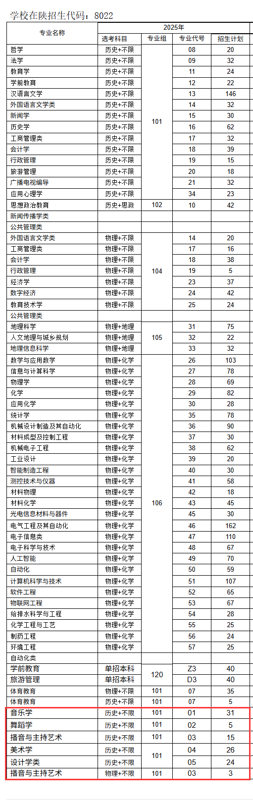2025年陕西省分专业招生计划-艺术类