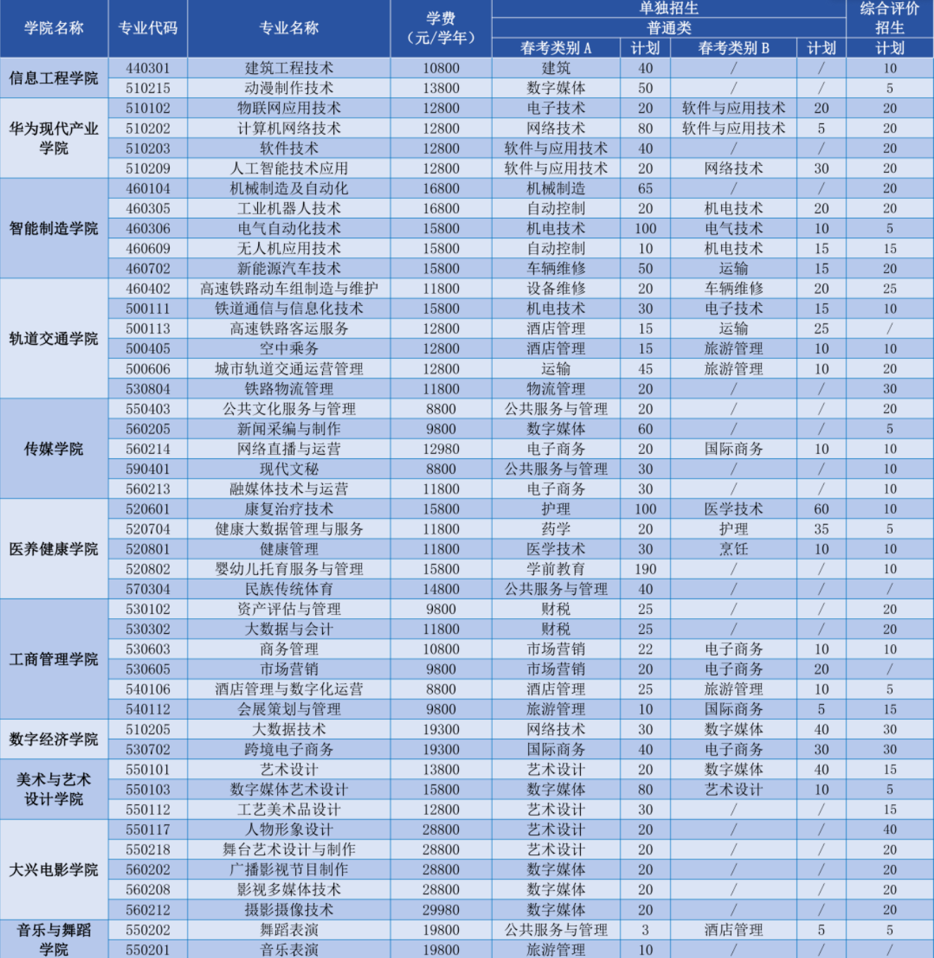 我校2025年单独招生计划2100人、综合评价招生计划650人,共计2750人,具体招生专业详见下图: