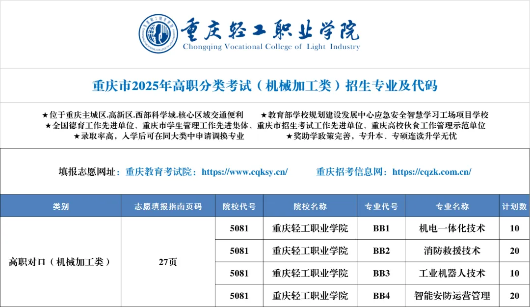 一、重庆轻工职业学院高职分类考试招生专业