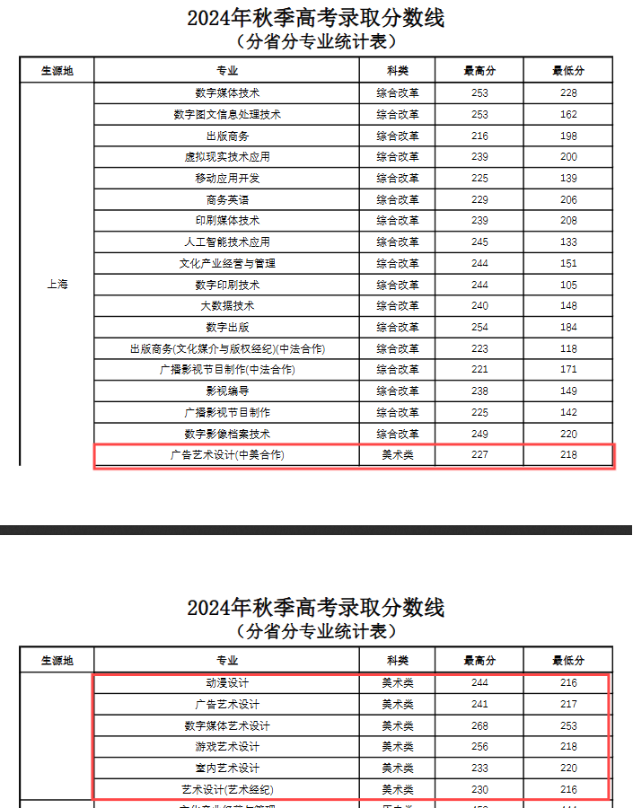1、2024年上海出版印刷高等专科学校艺术类录取分数线