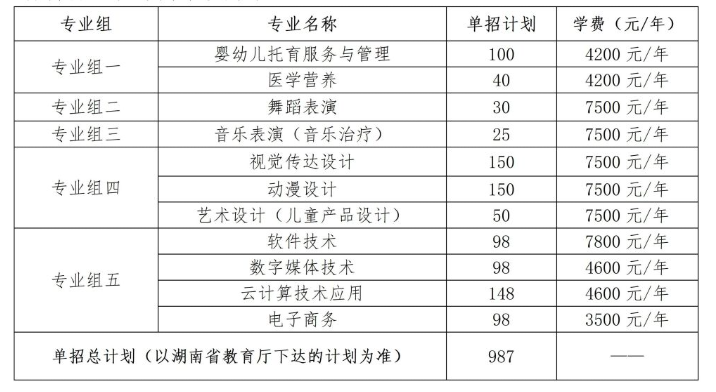 我校2025年单招总计划数为987人,其中包含单列计划的退役军人5人、体育特长生10人。本校2025年招生专业共11个。分专业单招计划及学费标准如下表,各专业最终学费标准以2025年湖南省物价主管部门审核为准。