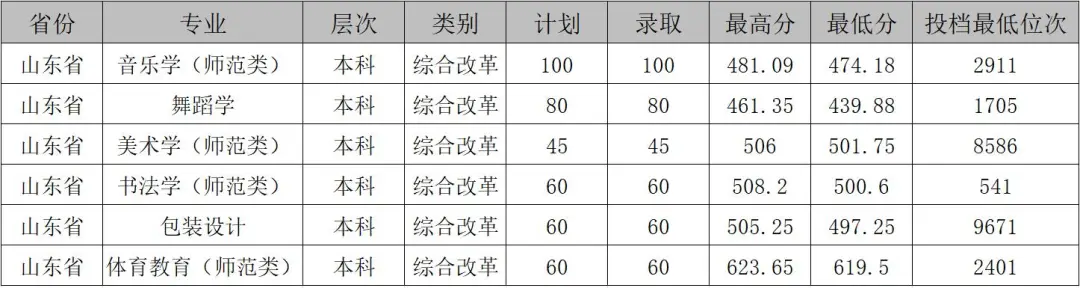 齐鲁师范学院2023年山东省艺术类、体育类本科批专业录取情况