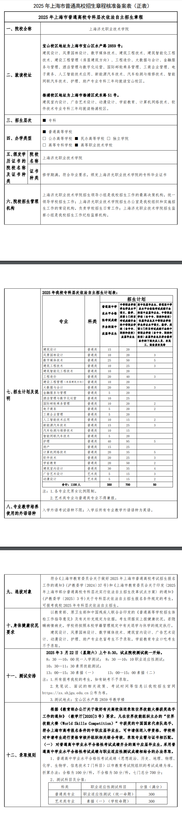 2025年上海济光职业技术学院专科自主招生章程
